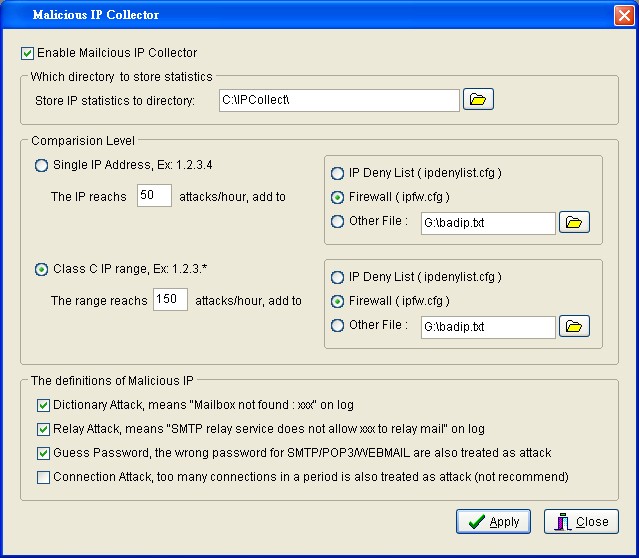 There are 2 kinds of level to do IP collection, for single IP address and for class C range. Admin also could determine which action should be treated as malicious action and how to deal with it. There are 3 types of method to deal with these IP addresses: (1) Add to IP Deny List (2) Add to firewall to block it (3) Add it to external file for reference usage.