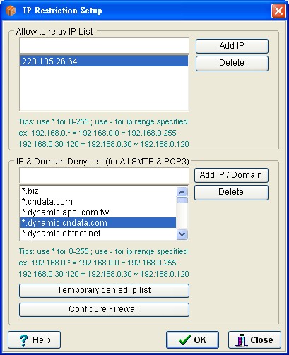 IP restriction dialog is designed for the admin to specify which IP is allowed to use the SMTP relay service and which IP/Domain is denied from using the SMTP service.