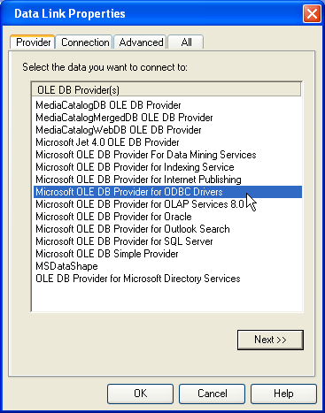5. Click [Browse] in below part, choose [Microsoft OLE DB Provider for ODBC Drivers], click [Next]