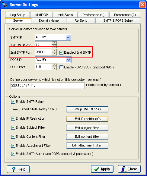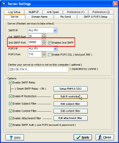 Then, let's go back to RaidenMAILD. Go to [Server settings] -> [Basic], Modify 2nd SMTP port to 25000 and enable the 2nd SMTP.