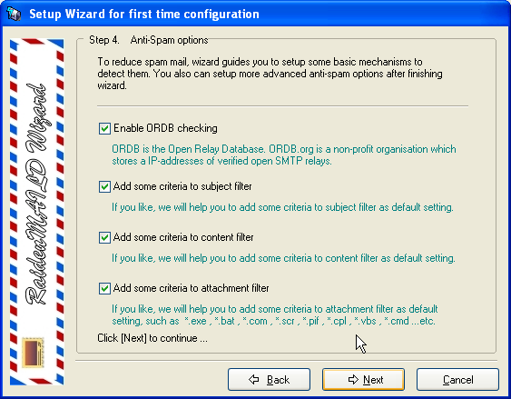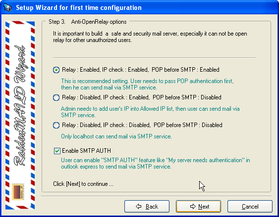 This form is for relay options. The default setting is recommended, it enables SMART SMTP RELAY (POP before SMTP) and SMTP AUTH. Click [Next] to continue.