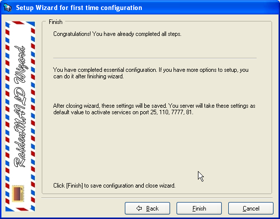 When wizard goes to this step, you already finish main configuration for your mail server, it is ok to click [Finish] to continue.