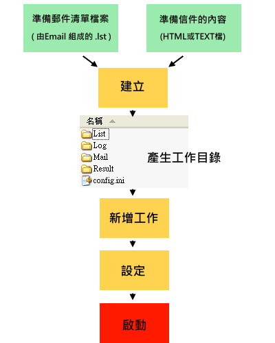 這裡要設定信件的相關資料, 包含了寄件人名稱, Email, 信件標題, 內容檔案(HTML 檔或純文字檔)及其所使用的格式檔案(*.eml).