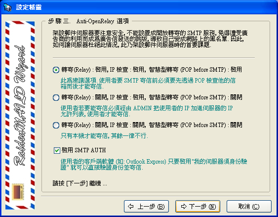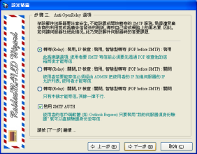 此頁面讓您設定轉寄的相關設定, 預設選項幫您啟用了智慧型轉寄 (POP before SMTP) 功能SMTP身份驗證的功能, 此為建議選項. 按 [下一步] 繼續.